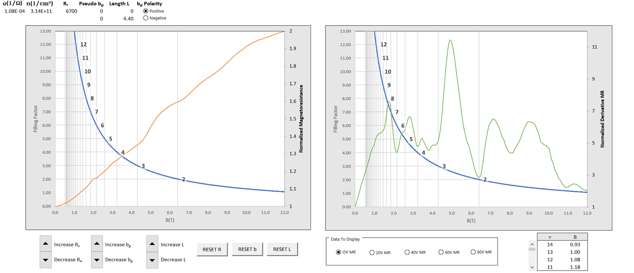 To analyze my data, I have generated a filling factor simulation superimposed with the magnetoresistance data to quantify potential Hall plateaus. Here is a screen shot of the application I developed using Macros in Excel programmed with Visual Basic for Applications (VBA):